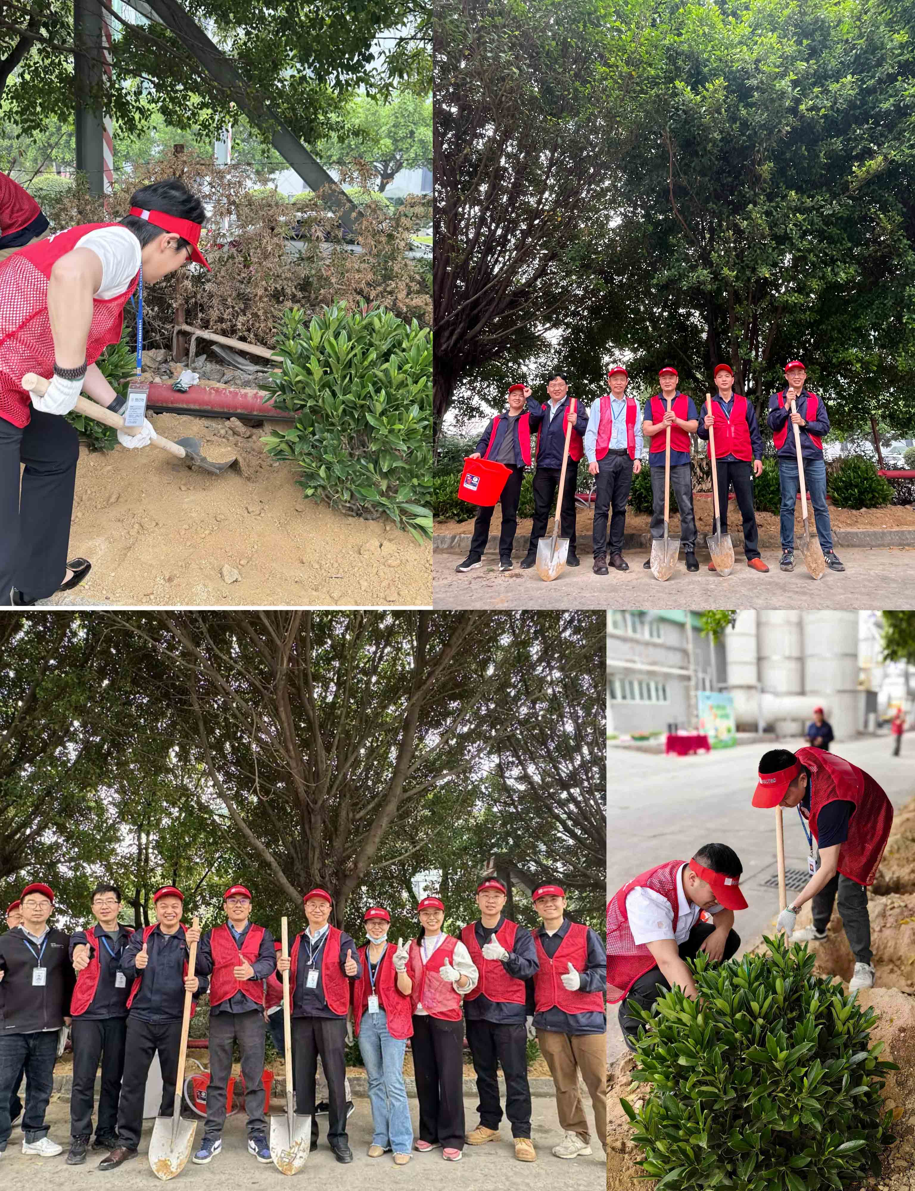 各中心有序领取马甲、遮阳帽、手套、铁锹、水桶等植树工具,开始挖树坑,浇水、填树苗、埋土、浇水等步骤,一步一步开始植起树来;大家在一起,干劲十足,稳稳当当的将每一颗小树苗扎入土中,我们的期望将会和小树苗共同成长。